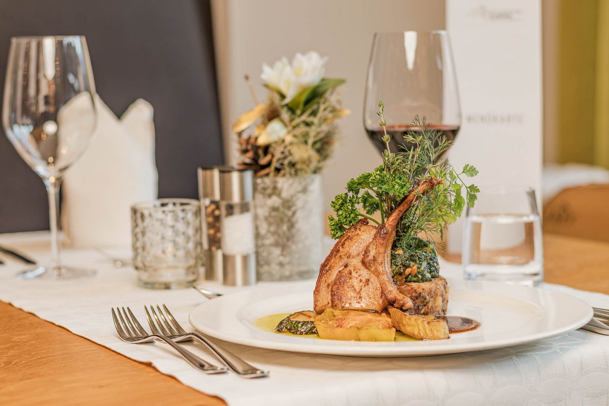 Gäste genießen eine Verwöhnpension mit Frühstücksbuffet, Nachmittagsjause und 4-Gang-Wahlmenü am Abend. Die Küche legt Wert auf regionale Produkte und saisonale Zutaten aus Vorarlberg. Der kulinarische Schwerpunkt liegt auf alpiner Tradition mit moderner Interpretation.