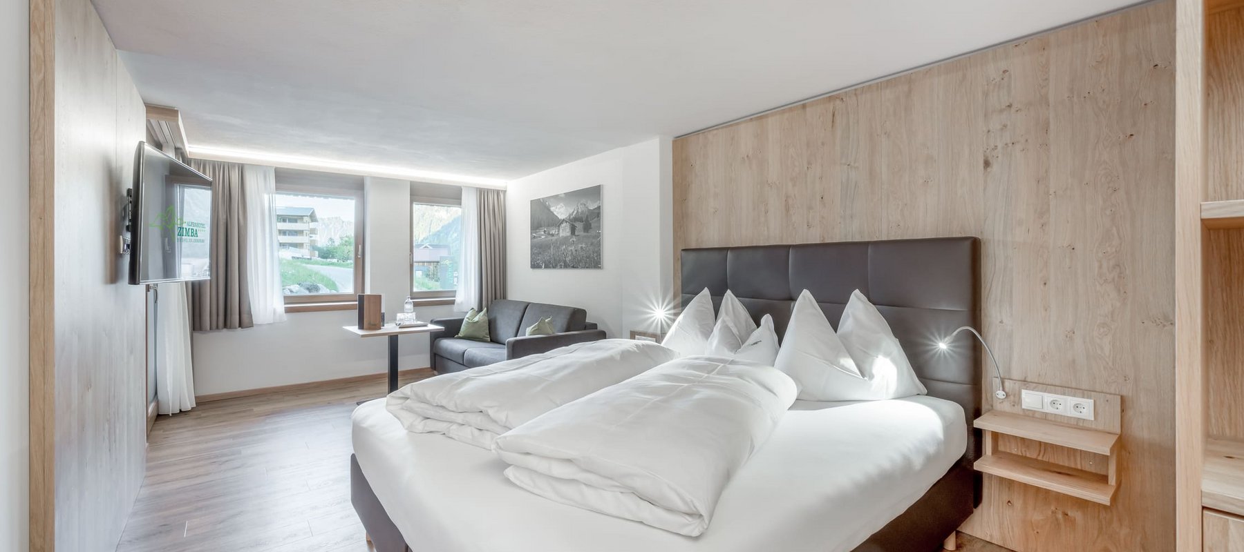 Die stilvollen Doppelzimmer „Valbona“ mit Holzboden sind mit einem gemütlichen Schlafsofa ausgestattet, welches Platz für eine 3. und 4. Person bietet. Ein hochwertiges Bettsystem mit Taschenfederkern-Matratzen und einer Bettlänge von 2,10 m verspricht erholsamen Schlaf.